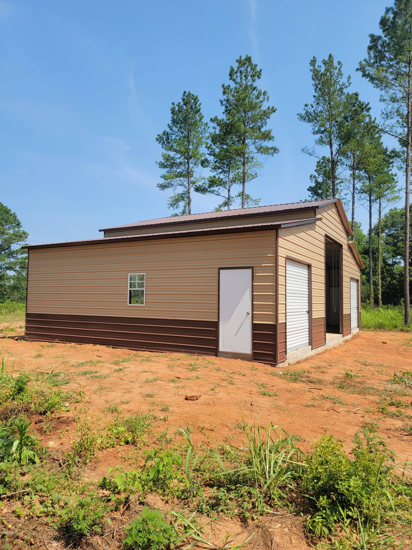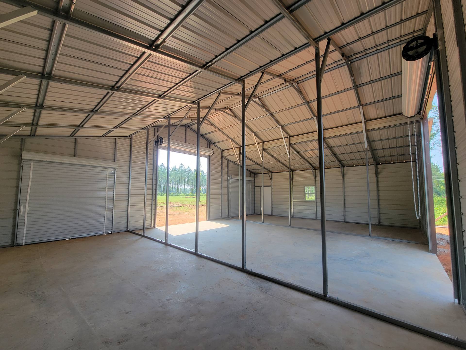 This large classic barn is 42′ wide by 30′ long and sits on a 14′ leg in the center and a 10′ leg on the lean-tos. The building comes equipped with (1) 10’x12′ chain hoist roll up door, (2) 8’x8′ roll up doors, (1) walk in door, and a horizontal boxed eave roof.