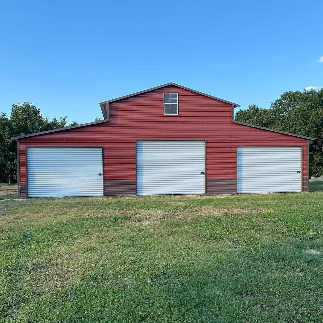 This barn is 42′ wide by 30′ long on 13′ and 8′ legs with a horizontal a-frame roof, two 10’W x 7’H roll up doors, one 10’W x 8’H roll up door, three windows and one 9-lite walk in door.
